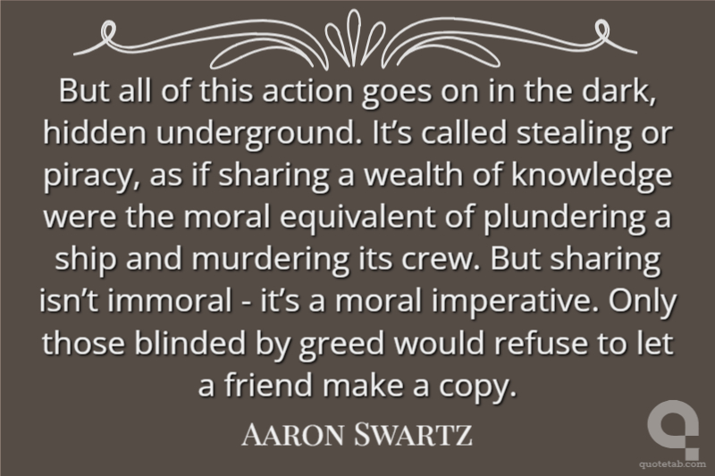 But all of this action goes on in the dark, hidden underground. It’s called stealing or piracy, as if sharing a wealth of knowledge were the moral equivalent of plundering a ship and murdering its crew. But sharing isn’t immoral - it’s a moral imperative. Only those blinded by greed would refuse to let a friend make a copy. Aaron Swartz