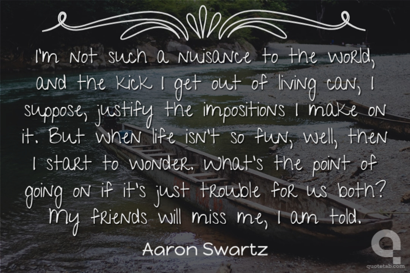 I'm not such a nuisance to the world, and the kick I get out of living can, I suppose, justify the impositions I make on it. But when life isn't so fun, well, then I start to wonder. What's the point of going on if it's just trouble for us both? My friends will miss me, I am told. Aaron Swartz