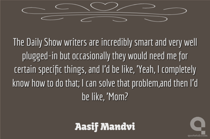 The Daily Show writers are incredibly smart and very well plugged-in but occasionally they would need me for certain specific things, and I'd be like, 'Yeah, I completely know how to do that; I can solve that problem,and then I'd be like, 'Mom? Aasif Mandvi