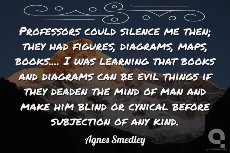 Professors could silence me then; they had figures, diagrams, maps, books.... I was learning that books and diagrams can be evil things if they deaden the mind of man and make him blind or cynical before subjection of any kind. Agnes Smedley