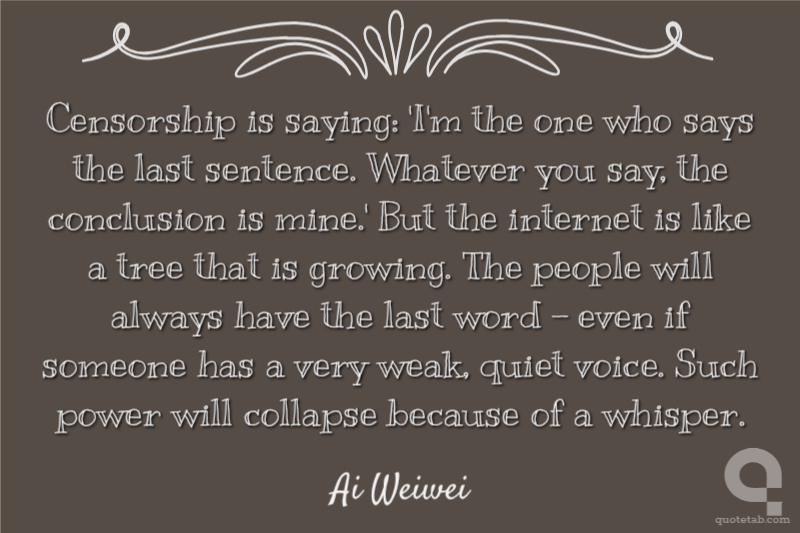 Censorship is saying: 'I'm the one who says the last sentence. Whatever you say, the conclusion is mine.' But the internet is like a tree that is growing. The people will always have the last word - even if someone has a very weak, quiet voice. Such power will collapse because of a whisper. Ai Weiwei