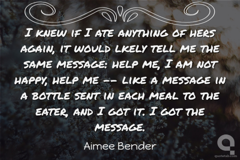 I knew if I ate anything of hers again, it would lkely tell me the same message: help me, I am not happy, help me -- like a message in a bottle sent in each meal to the eater, and I got it. I got the message. Aimee Bender