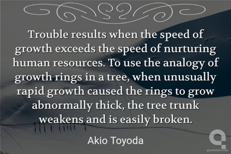 Trouble results when the speed of growth exceeds the speed of nurturing human resources. To use the analogy of growth rings in a tree, when unusually rapid growth caused the rings to grow abnormally thick, the tree trunk weakens and is easily broken. Akio Toyoda