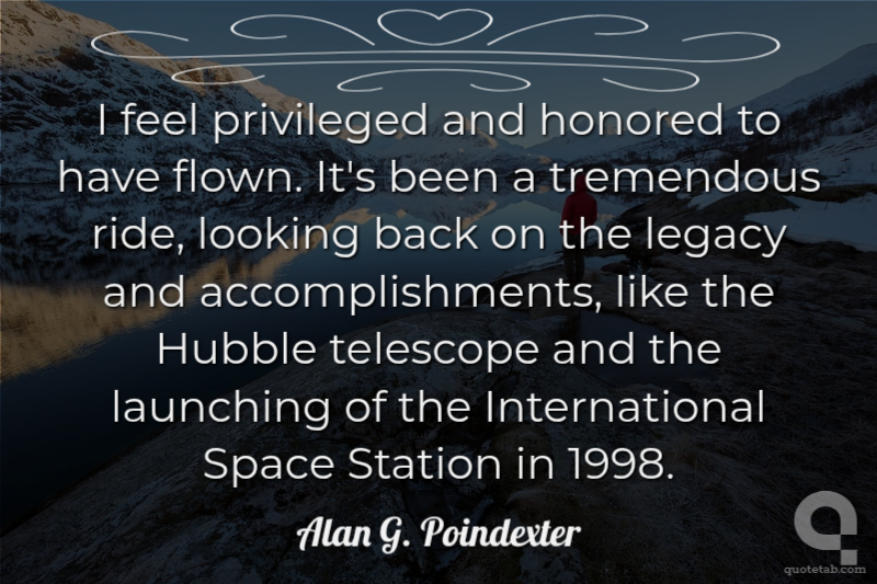 I feel privileged and honored to have flown. It's been a tremendous ride, looking back on the legacy and accomplishments, like the Hubble telescope and the launching of the International Space Station in 1998. Alan G. Poindexter