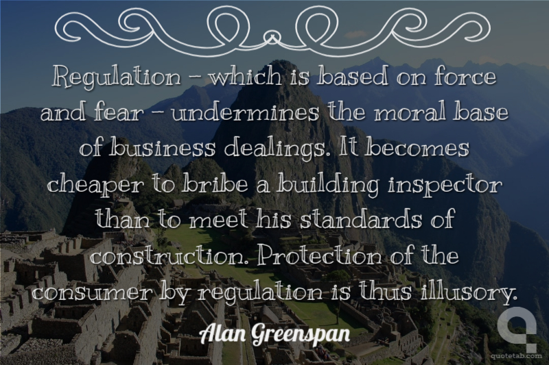 Regulation - which is based on force and fear - undermines the moral base of business dealings. It becomes cheaper to bribe a building inspector than to meet his standards of construction. Protection of the consumer by regulation is thus illusory. Alan Greenspan
