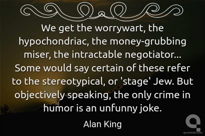 We get the worrywart, the hypochondriac, the money-grubbing miser, the intractable negotiator... Some would say certain of these refer to the stereotypical, or 'stage' Jew. But objectively speaking, the only crime in humor is an unfunny joke. Alan King