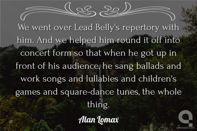 We went over Lead Belly's repertory with him. And we helped him round it off into concert form so that when he got up in front of his audience, he sang ballads and work songs and lullabies and children's games and square-dance tunes, the whole thing. Alan Lomax