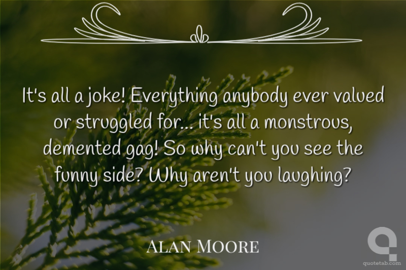 It's all a joke! Everything anybody ever valued or struggled for... it's all a monstrous, demented gag! So why can't you see the funny side? Why aren't you laughing? Alan Moore