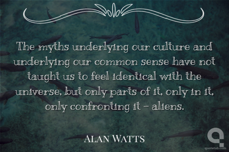 The myths underlying our culture and underlying our common sense have not taught us to feel identical with the universe, but only parts of it, only in it, only confronting it - aliens. Alan Watts