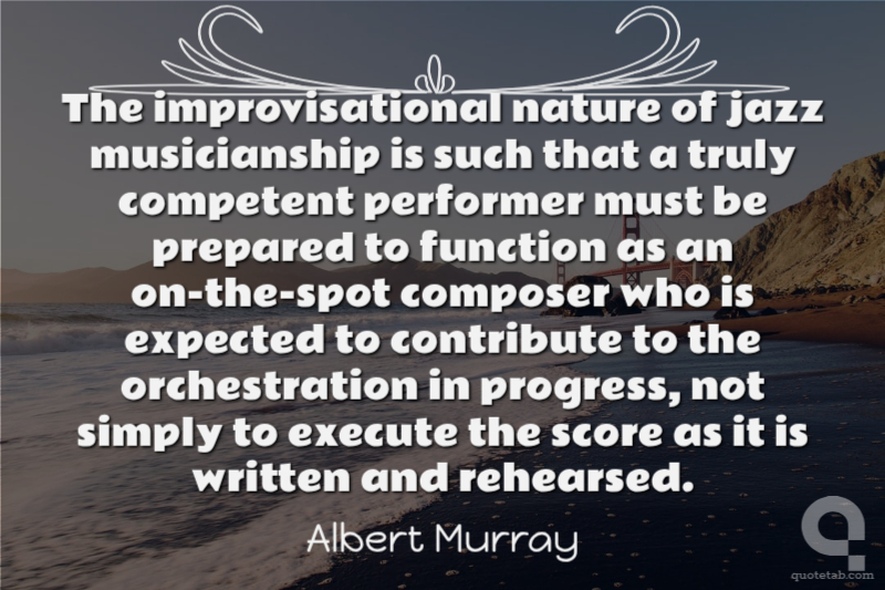 The improvisational nature of jazz musicianship is such that a truly competent performer must be prepared to function as an on-the-spot composer who is expected to contribute to the orchestration in progress, not simply to execute the score as it is written and rehearsed. Albert Murray