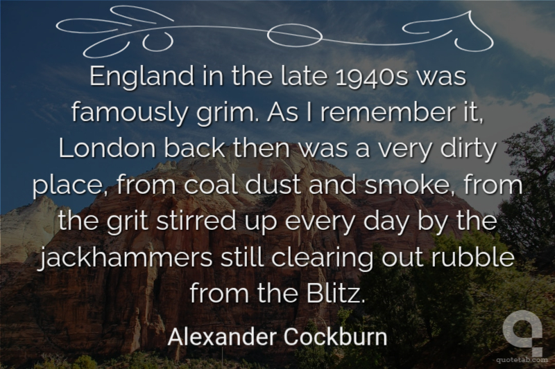 England in the late 1940s was famously grim. As I remember it, London back then was a very dirty place, from coal dust and smoke, from the grit stirred up every day by the jackhammers still clearing out rubble from the Blitz. Alexander Cockburn