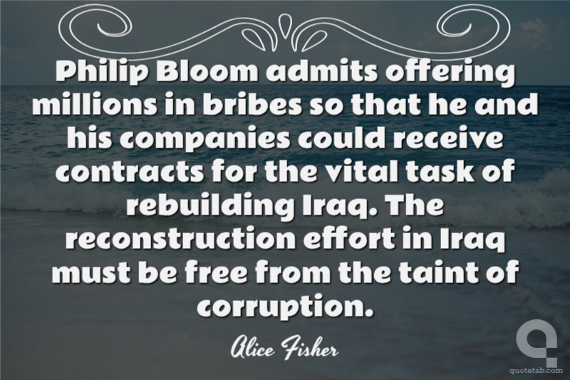 Philip Bloom admits offering millions in bribes so that he and his companies could receive contracts for the vital task of rebuilding Iraq. The reconstruction effort in Iraq must be free from the taint of corruption. Alice Fisher