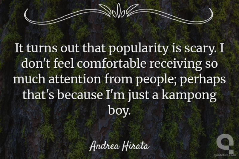 It turns out that popularity is scary. I don't feel comfortable receiving so much attention from people; perhaps that's because I'm just a kampong boy. Andrea Hirata