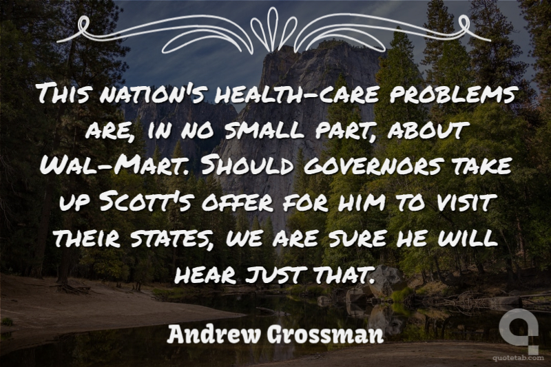 This nation's health-care problems are, in no small part, about Wal-Mart. Should governors take up Scott's offer for him to visit their states, we are sure he will hear just that. Andrew Grossman