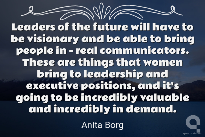 Leaders of the future will have to be visionary and be able to bring people in - real communicators. These are things that women bring to leadership and executive positions, and it's going to be incredibly valuable and incredibly in demand. Anita Borg