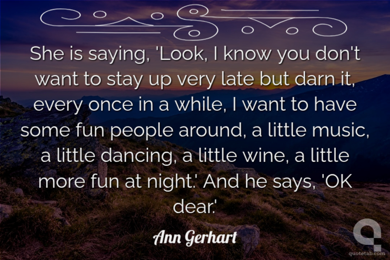 She is saying, 'Look, I know you don't want to stay up very late but darn it, every once in a while, I want to have some fun people around, a little music, a little dancing, a little wine, a little more fun at night.' And he says, 'OK dear.' Ann Gerhart