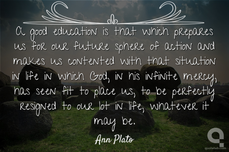 A good education is that which prepares us for our future sphere of action and makes us contented with that situation in life in which God, in his infinite mercy, has seen fit to place us, to be perfectly resigned to our lot in life, whatever it may be. Ann Plato