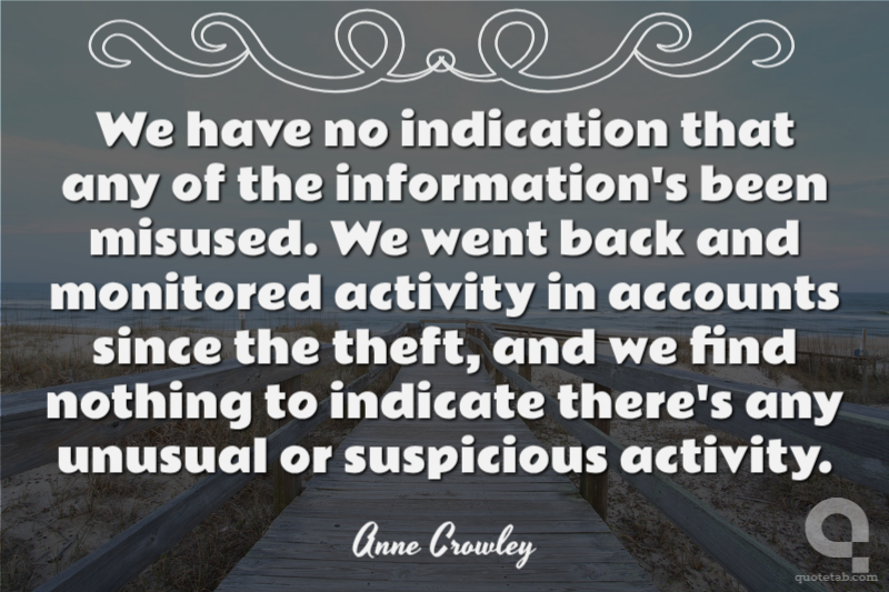 We have no indication that any of the information's been misused. We went back and monitored activity in accounts since the theft, and we find nothing to indicate there's any unusual or suspicious activity. Anne Crowley