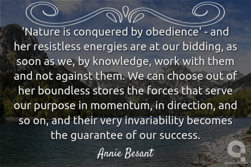 'Nature is conquered by obedience' - and her resistless energies are at our bidding, as soon as we, by knowledge, work with them and not against them. We can choose out of her boundless stores the forces that serve our purpose in momentum, in direction, and so on, and their very invariability becomes the guarantee of our success. Annie Besant