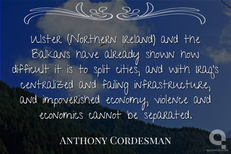 Ulster (Northern Ireland) and the Balkans have already shown how difficult it is to split cities, and with Iraq's centralized and failing infrastructure, and impoverished economy, violence and economics cannot be separated. Anthony Cordesman