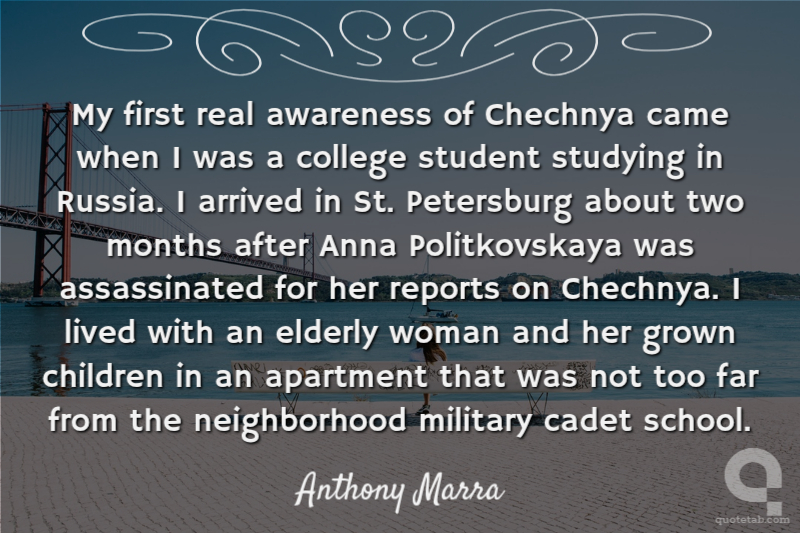 My first real awareness of Chechnya came when I was a college student studying in Russia. I arrived in St. Petersburg about two months after Anna Politkovskaya was assassinated for her reports on Chechnya. I lived with an elderly woman and her grown children in an apartment that was not too far from the neighborhood military cadet school. Anthony Marra