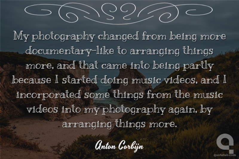 My photography changed from being more documentary-like to arranging things more, and that came into being partly because I started doing music videos, and I incorporated some things from the music videos into my photography again, by arranging things more. Anton Corbijn