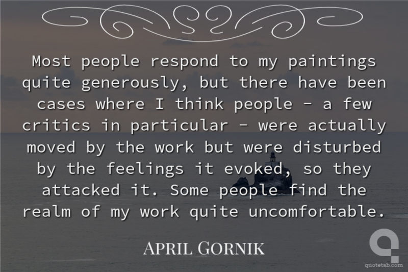 Most people respond to my paintings quite generously, but there have been cases where I think people - a few critics in particular - were actually moved by the work but were disturbed by the feelings it evoked, so they attacked it. Some people find the realm of my work quite uncomfortable. April Gornik