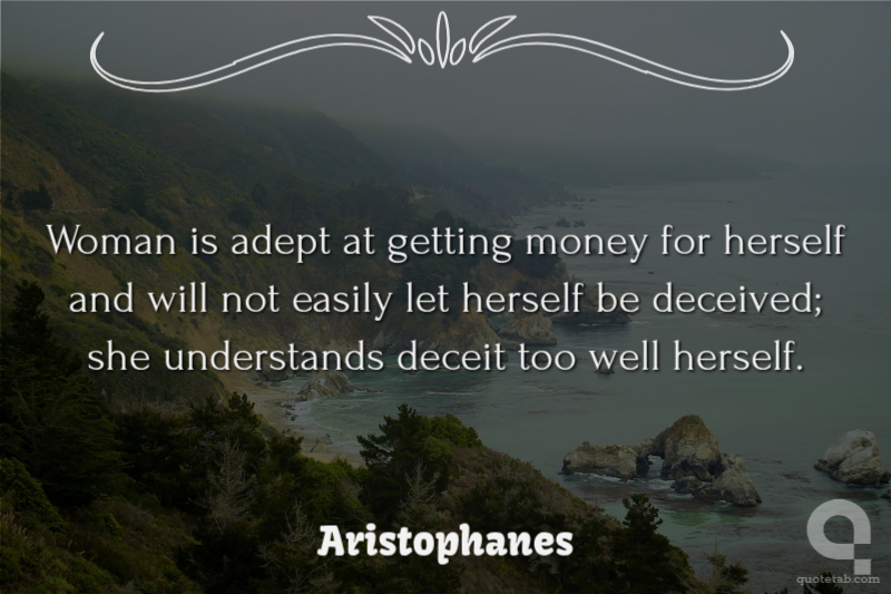 Woman is adept at getting money for herself and will not easily let herself be deceived; she understands deceit too well herself. Aristophanes