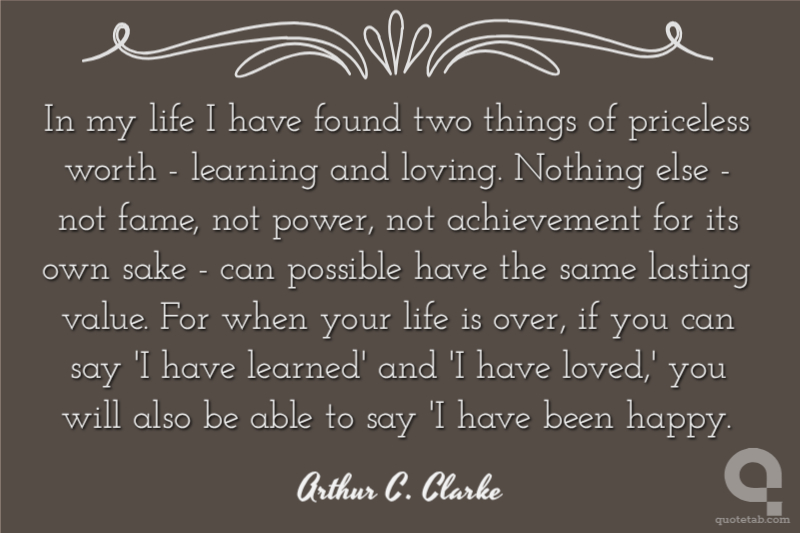 In my life I have found two things of priceless worth - learning and loving. Nothing else - not fame, not power, not achievement for its own sake - can possible have the same lasting value. For when your life is over, if you can say 'I have learned' and 'I have loved,' you will also be able to say 'I have been happy. Arthur C. Clarke