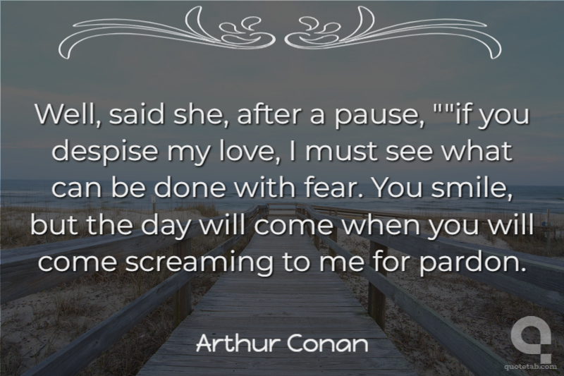 Well, said she, after a pause, ""if you despise my love, I must see what can be done with fear. You smile, but the day will come when you will come screaming to me for pardon. Arthur Conan