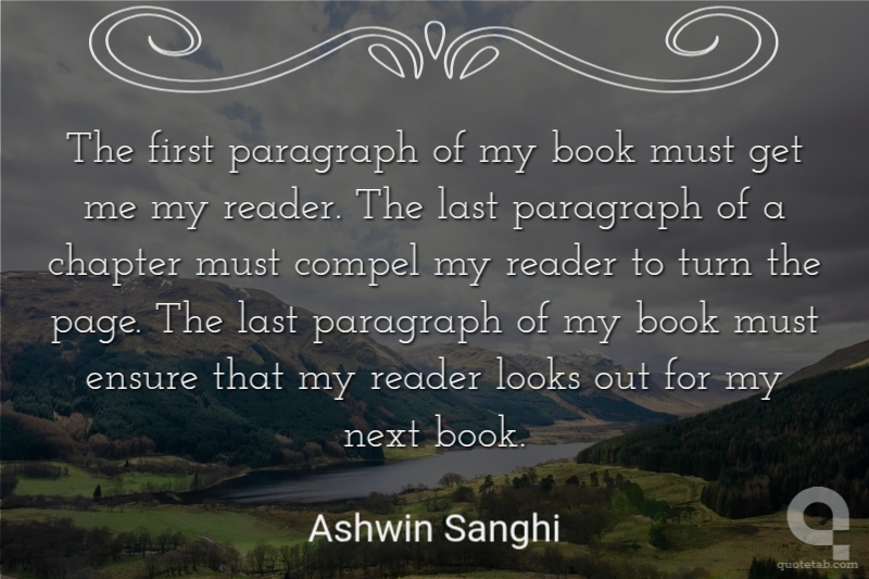 The first paragraph of my book must get me my reader. The last paragraph of a chapter must compel my reader to turn the page. The last paragraph of my book must ensure that my reader looks out for my next book. Ashwin Sanghi