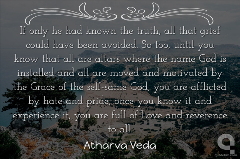 If only he had known the truth, all that grief could have been avoided. So too, until you know that all are altars where the name God is installed and all are moved and motivated by the Grace of the self-same God, you are afflicted by hate and pride; once you know it and experience it, you are full of Love and reverence to all. Atharva Veda