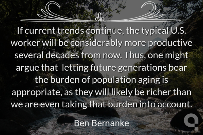 If current trends continue, the typical U.S. worker will be considerably more productive several decades from now. Thus, one might argue that letting future generations bear the burden of population aging is appropriate, as they will likely be richer than we are even taking that burden into account. Ben Bernanke