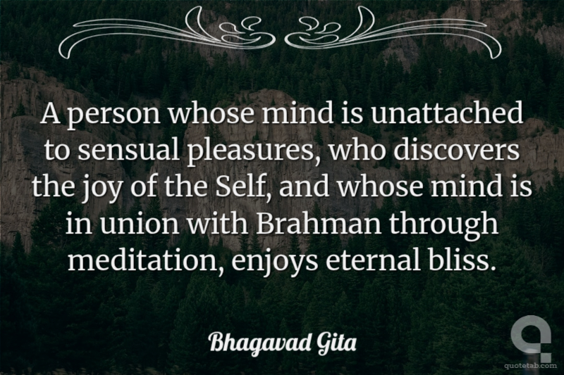 A person whose mind is unattached to sensual pleasures, who discovers the joy of the Self, and whose mind is in union with Brahman through meditation, enjoys eternal bliss. Bhagavad Gita