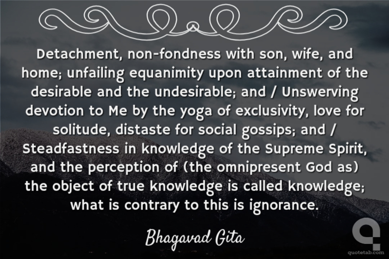 Detachment, non-fondness with son, wife, and home; unfailing equanimity upon attainment of the desirable and the undesirable; and / Unswerving devotion to Me by the yoga of exclusivity, love for solitude, distaste for social gossips; and / Steadfastness in knowledge of the Supreme Spirit, and the perception of (the omnipresent God as) the object of true knowledge is called knowledge; what is contrary to this is ignorance. Bhagavad Gita
