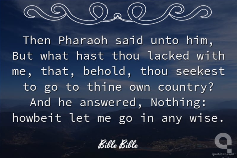 Then Pharaoh said unto him, But what hast thou lacked with me, that, behold, thou seekest to go to thine own country? And he answered, Nothing: howbeit let me go in any wise. Bible Bible