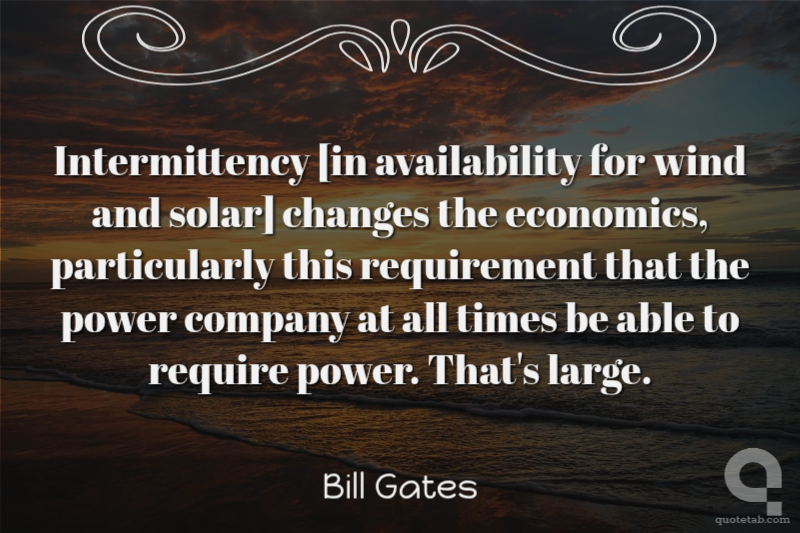 Intermittency [in availability for wind and solar] changes the economics, particularly this requirement that the power company at all times be able to require power. That's large. Bill Gates
