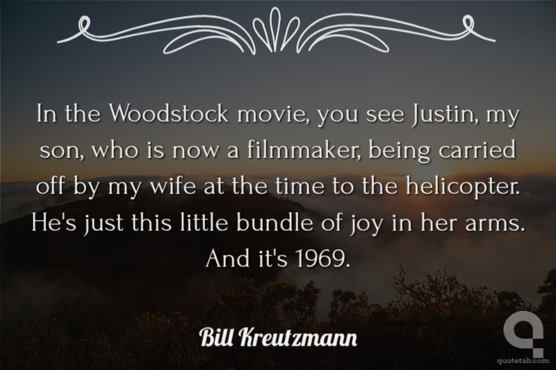 In the Woodstock movie, you see Justin, my son, who is now a filmmaker, being carried off by my wife at the time to the helicopter. He's just this little bundle of joy in her arms. And it's 1969. Bill Kreutzmann
