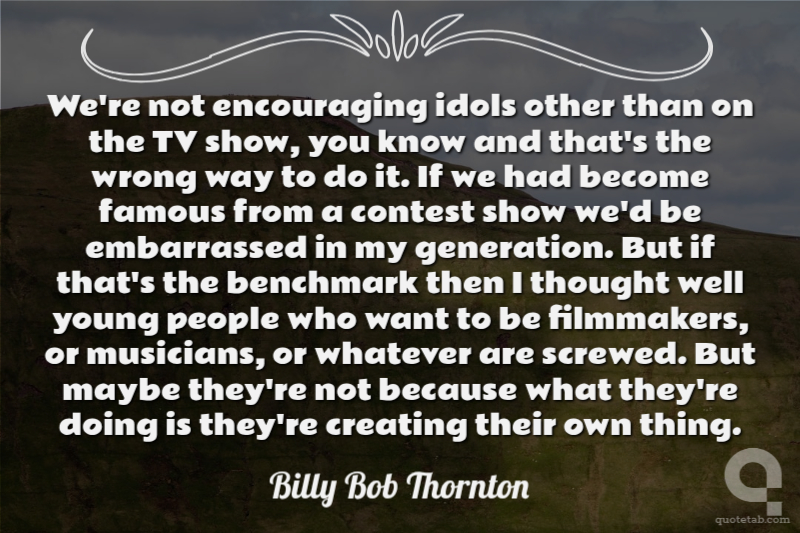 We're not encouraging idols other than on the TV show, you know and that's the wrong way to do it. If we had become famous from a contest show we'd be embarrassed in my generation. But if that's the benchmark then I thought well young people who want to be filmmakers, or musicians, or whatever are screwed. But maybe they're not because what they're doing is they're creating their own thing. Billy Bob Thornton