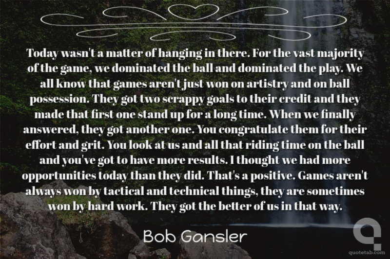 Today wasn't a matter of hanging in there. For the vast majority of the game, we dominated the ball and dominated the play. We all know that games aren't just won on artistry and on ball possession. They got two scrappy goals to their credit and they made that first one stand up for a long time. When we finally answered, they got another one. You congratulate them for their effort and grit. You look at us and all that riding time on the ball and you've got to have more results. I thought we had more opportunities today than they did. That's a positive. Games aren't always won by tactical and technical things, they are sometimes won by hard work. They got the better of us in that way. Bob Gansler