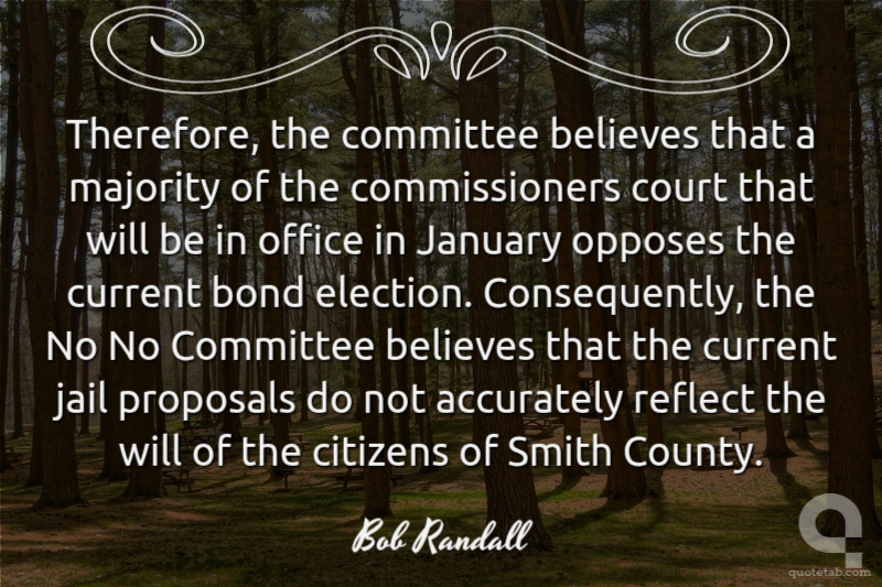 Therefore, the committee believes that a majority of the commissioners court that will be in office in January opposes the current bond election. Consequently, the No No Committee believes that the current jail proposals do not accurately reflect the will of the citizens of Smith County. Bob Randall