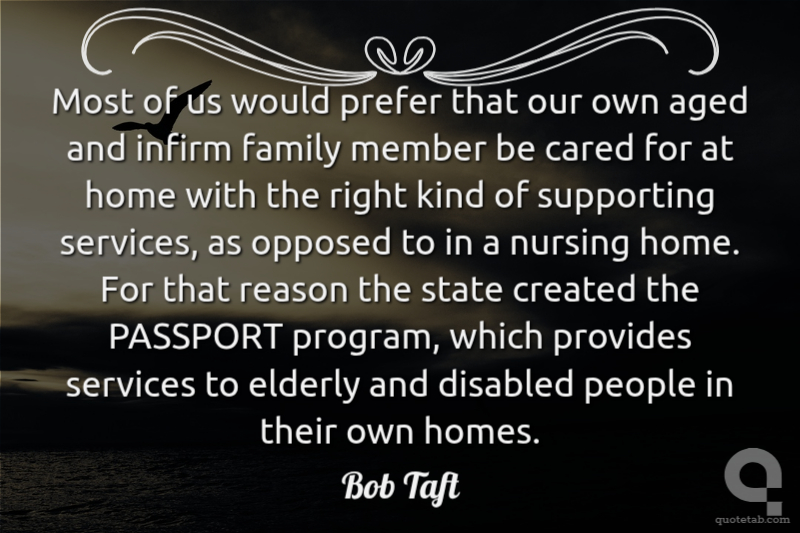 Most of us would prefer that our own aged and infirm family member be cared for at home with the right kind of supporting services, as opposed to in a nursing home. For that reason the state created the PASSPORT program, which provides services to elderly and disabled people in their own homes. Bob Taft
