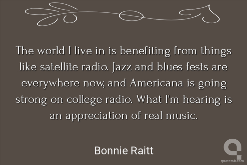 The world I live in is benefiting from things like satellite radio. Jazz and blues fests are everywhere now, and Americana is going strong on college radio. What I'm hearing is an appreciation of real music. Bonnie Raitt