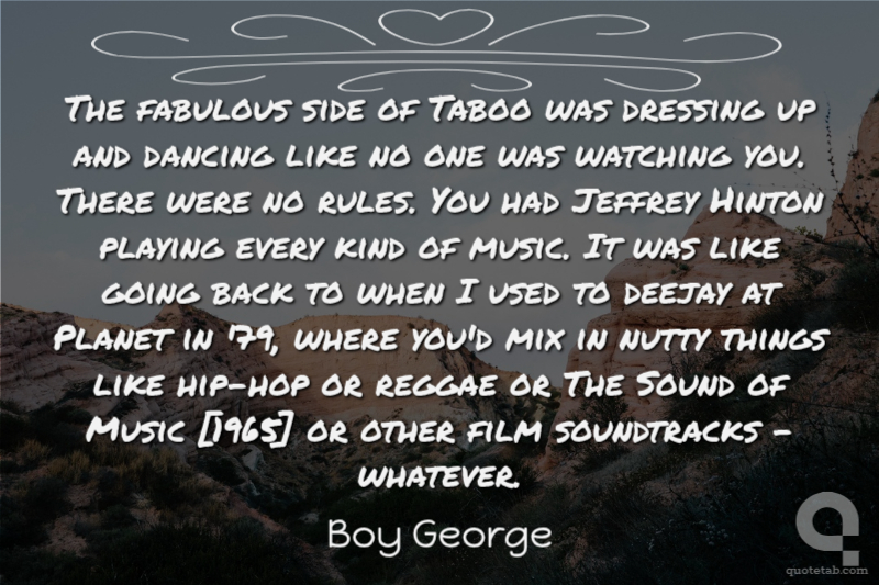 The fabulous side of Taboo was dressing up and dancing like no one was watching you. There were no rules. You had Jeffrey Hinton playing every kind of music. It was like going back to when I used to deejay at Planet in '79, where you'd mix in nutty things like hip-hop or reggae or The Sound of Music [1965] or other film soundtracks - whatever. Boy George