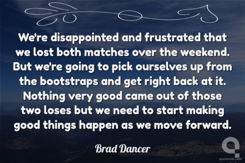 We're disappointed and frustrated that we lost both matches over the weekend. But we're going to pick ourselves up from the bootstraps and get right back at it. Nothing very good came out of those two loses but we need to start making good things happen as we move forward. Brad Dancer