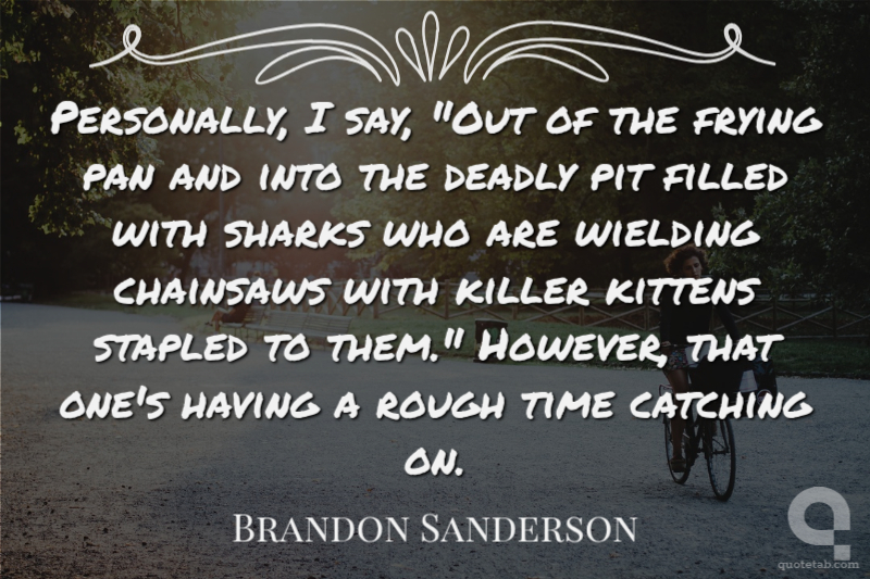 Personally, I say, "Out of the frying pan and into the deadly pit filled with sharks who are wielding chainsaws with killer kittens stapled to them." However, that one's having a rough time catching on. Brandon Sanderson