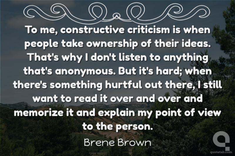 To me, constructive criticism is when people take ownership of their ideas. That's why I don't listen to anything that's anonymous. But it's hard; when there's something hurtful out there, I still want to read it over and over and memorize it and explain my point of view to the person. Brene Brown