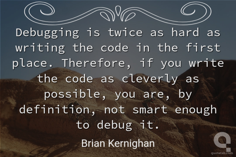 Debugging is twice as hard as writing the code in the first place. Therefore, if you write the code as cleverly as possible, you are, by definition, not smart enough to debug it. Brian Kernighan