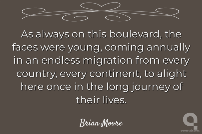 As always on this boulevard, the faces were young, coming annually in an endless migration from every country, every continent, to alight here once in the long journey of their lives. Brian Moore
