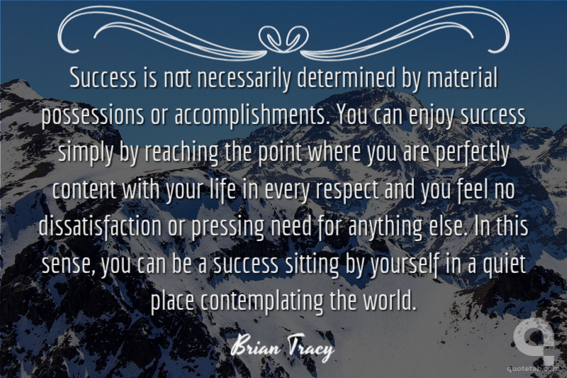 Success is not necessarily determined by material possessions or accomplishments. You can enjoy success simply by reaching the point where you are perfectly content with your life in every respect and you feel no dissatisfaction or pressing need for anything else. In this sense, you can be a success sitting by yourself in a quiet place contemplating the world. Brian Tracy